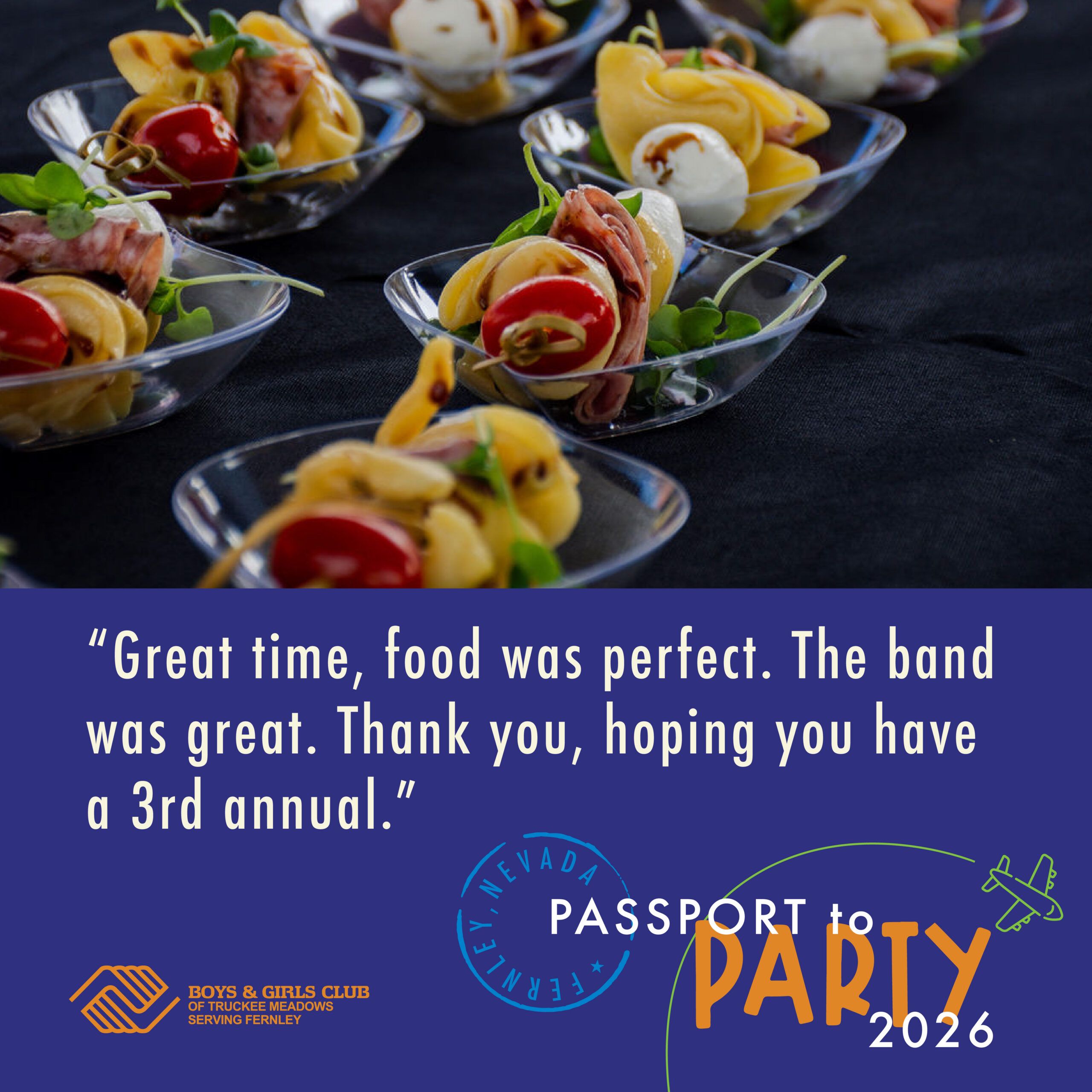 Join us for a first-class eating and drinking extravaganza benefitting Fernley’s Boys & Girls Club! Taste authentic cuisine from four incredible countries paired with signature beverages. Bid on exciting auction packages, enjoy live music, fly by all four food stations, and be entered in a drawing to win our grand prize!