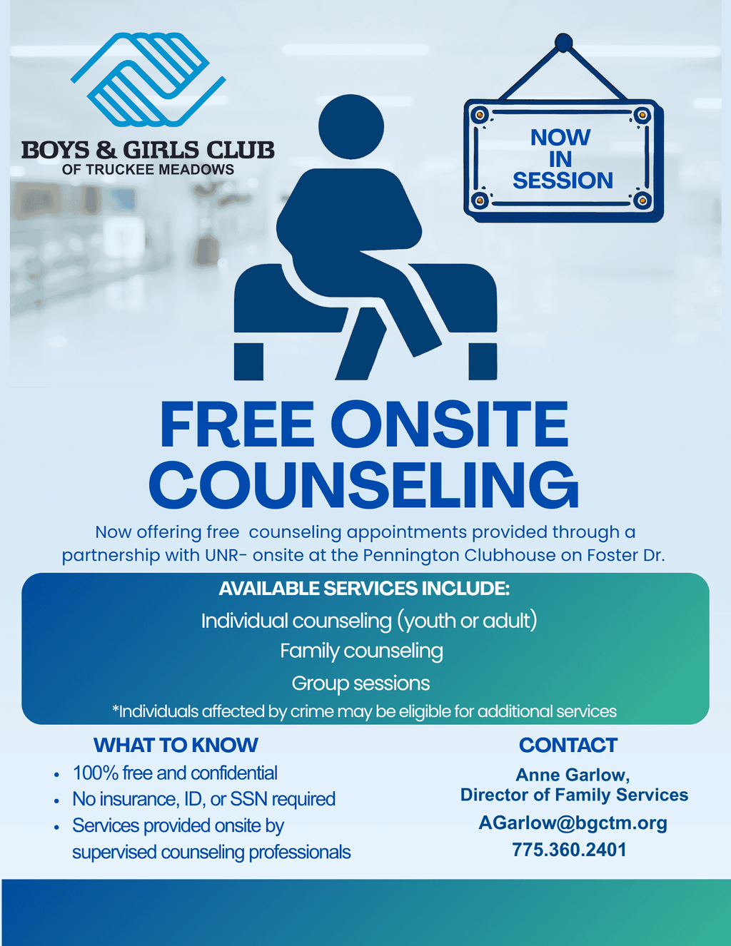 Located upstairs at the Pennington Clubhouse in Reno, the Bright Futures Wellness Center includes:
